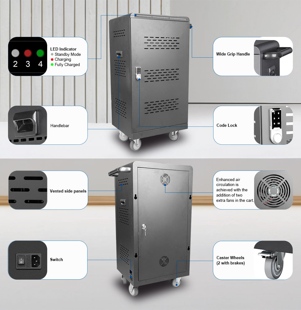 Intelligentes Lade- und Stromversorgungssystem: Mit integriertem Smart-Lademodul mit integrierten USB-C-Multiport-Ladefunktionen oder dedizierten Steckplätzen für synchronisiertes Schnellladen ohne Gerätebeschädigung; einem professionell gestalteten Schaltkreislayout mit im Gerät verborgenen Kabeln, um Freilegung, Verschleiß und Zerren zu verhindern; und robusten Sicherheitsfunktionen wie Überlast-, Kurzschluss- und Überhitzungsschutz, der den Sicherheitsstandards entspricht und mit einem Leistungsschalter ausgestattet ist, um einen ausfallsicheren Ladevorgang zu gewährleisten. Dies wird mit einer robusten Konstruktion und einem benutzerorientierten Design kombiniert, das auf einen langlebigen Stahlrahmen, übersichtliche, geschichtete Fächer für Geräte unterschiedlicher Größe und gleichzeitiger Vermeidung von Kratzern sowie durchdachte Kühlung und Zugänglichkeit für einen zuverlässigen, benutzerfreundlichen Betrieb setzt.